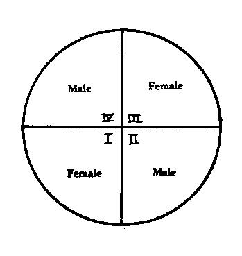 The term "quadrant" means quarter. The first quarter of the chart from AC to nadir is female, the second quarter from nadir to DC is male, the third quarter from DC to MC is female, and the fourth quarter from MC to AC is male. Thus if the sex position of one of the factors, either AC or Moon, is in an opposite sex from that of the other factor, the sex of the quadrant in which the Moon is placed at Epoch determines the sex of the native.
