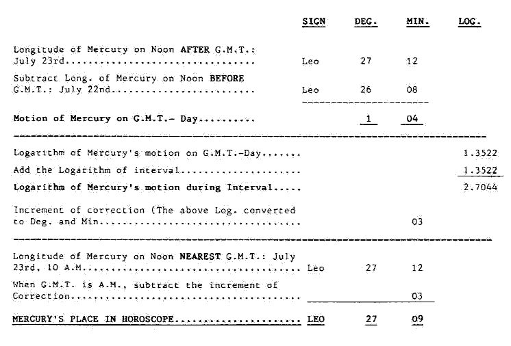 Before entering planets in the horoscope, it is wise to make a list of their places, beginning with those in the first degree of Aries, if any; then those in the succeeding degrees of the same sign; then the planets in the first degrees of Taurus; then those in the following degrees and so on through all the signs, following the circle of the Zodiac. This method, applied to the planets of our example horoscope gives the following list: