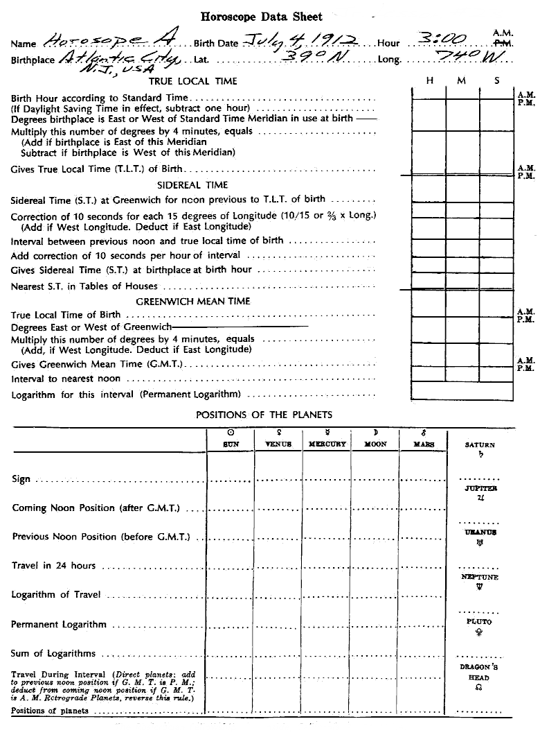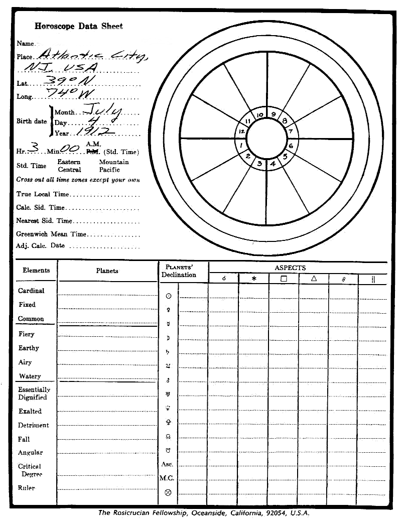1. When you have studied this Astrology Independent Study Module, please set up the practice horoscope below, (Birth Place: Atlantic City, NJ, USA; Lat.: 39 deg. N.; Long.: 74 deg. W.; Birth Date: July 4, 1912; Birth Time: 3:00 A.M.) and return it to us. Upon receipt of this we will send you the next Astrology Independent Study Module. (optional)