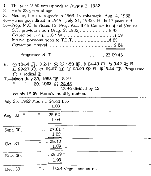 When a New Moon is a solar eclipse, it produces: first the usual effect of a lunation during the current month if in aspect with any of the radical planets. Secondly: similar effects during the months of the following year, when aspects of the same nature are formed with place of the eclipse. That is to say, if an eclipse fell, for instance, on Uranus in 23 degrees of Aries, in this boy's horoscope, it not only will have an influence at the time when the eclipse is formed, but also when a lunation of about the same degree would fall in Cancer, making a square — this in midsummer — or another in opposition in Libra in the Fall; again another square in midwinter from Capricorn.