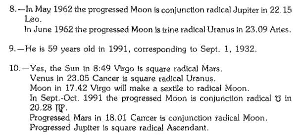 As Neptune advances about 2 degrees per year we approximate its position in 1992, when the age of our subject is 60, to be about 18 degrees in Capricorn, which is in opposition to the radical Moon. The delineation reads: "If Neptune is afflicted in the natal chart, these transits mark a period of weird and uncanny experiences, mental and physical lassitude, etc."