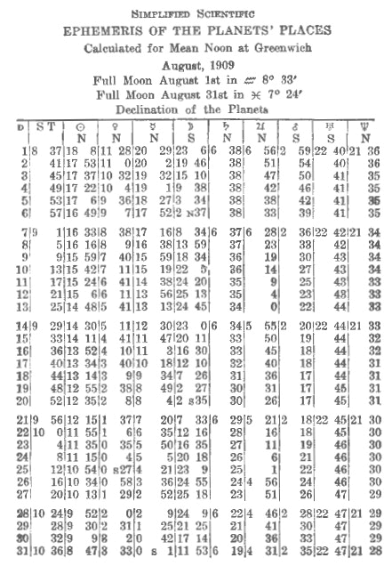 After completing our calculations we cease to make believe about living in 1910, and take up the ephemeris for 1915 to see if our rules have given the right result; and we find that a solar eclipse did occur on the morning of the 14th of February 1915, in Aquarius, twenty-four degrees, forty-two minutes, proving the rule to have given an essentially correct result. See 'Transits.'