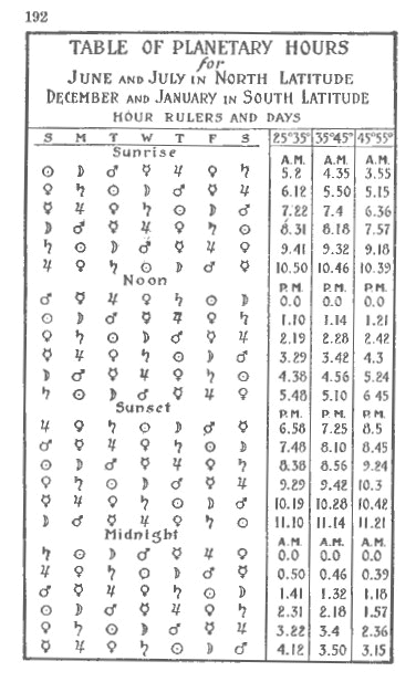 When we speak of planetary 'hours,' it must be understood that these hours are not sixty minutes in length, but vary in a wide measure, with the time of the year, and the place of your residence. Near the equator the divergence is least; and it increases the further North we go because a planetary hour is one twelfth part of the time between Sunset on a particular day and Sunrise the next morning, or it is one twelfth part of a particular day beginning at Sunrise and ending at Sunset.