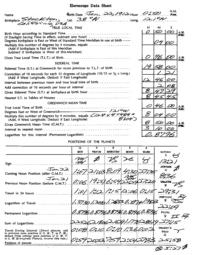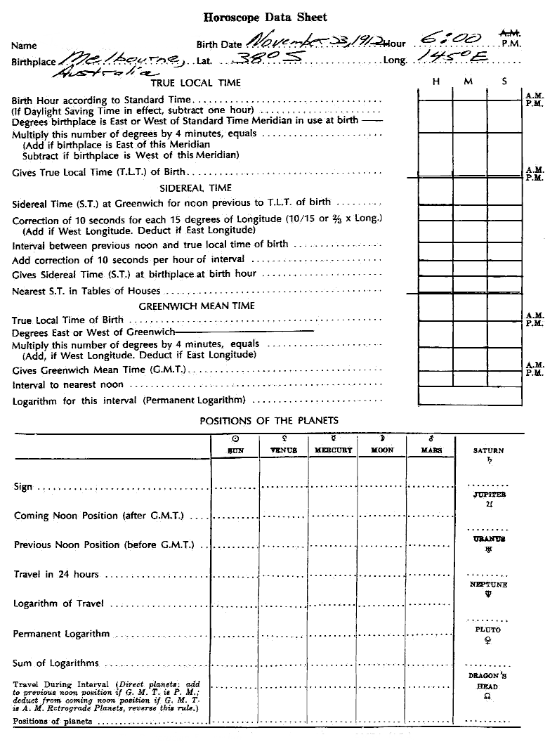 1. When you have studied this Astrology Independent Study Module, please set up the practice horoscope below [Birth Place: Melbourne, Australia; Lat.: 38 deg. S.; Long.: 145 deg. E.; Birth Date: November 23, 1912; Birth Time: 6:00 P.M.], and email it to us. (optional)