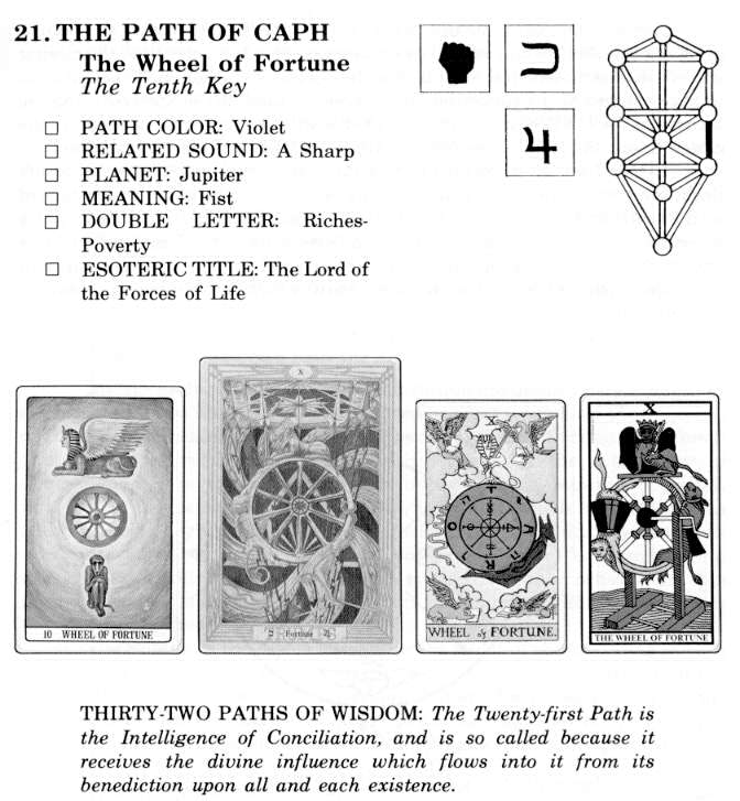 The glyph in the Tarot representing Yod is the Wheel of Fate or destiny presided over by the Sphinx. Upon the wheel are four letters which mean "wheel", ROTA, but as the wheel revolves, these letters seem to form the word Taro. Also inscribed on the wheel are the four sacred letters of the Tetragrammaton, Yod He Vau He, signifying that God and no other Is the ruler of destiny, both for man and the universe. Yod is the initial letter of the Tetragrammaton.