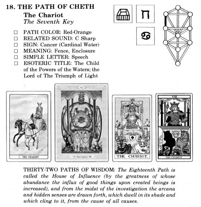 Physiologically, Cheth relates to the breasts as symbols of the fountain of life flowing from the bi-une Spirit Power. It stands symbolic of the great cosmic Hierarchy of Beings who work through the sign Cancer in the zodiac. Cancer is the great Mother sign of the zodiac, the Madonna of the Skies. (Virgo is the Virgin). The keywords of Cancer are Service, Love, and Sacrifice.