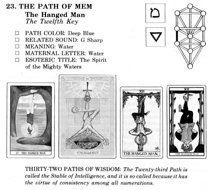 Numerically, Lamed's power of 30 again associates with the Triune Powers of Spirit; it is the triple power of 10. As twelfth in the procession of letters, however, it is again three, (1+2=3), showing that man must be purified by continued communication with the higher dimensional worlds. Truly, humanity hangs upon the cross of matter and suffers the wounds inflicted by the goad of karma until, by its own efforts, through sacrifice, love and service, it releases itself. The Tarot glyph for Lamed is the Hanged Man, which refers to the ego in the present earth period, who is crucified between his higher and lower natures.