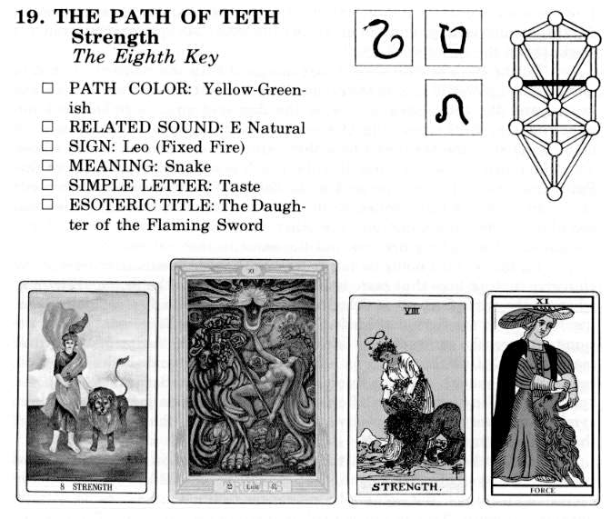 Physiologically, Kaph represents the hands in the act of holding. The hand is a channel for the inflow and outflow of spiritual power; the attitude of holding suggest the keyword, Strength. We are again reminded of the names of the pillars, Jachin and Boaz, which are established in the strength of the spirit. The Tarot picture is that of a virgin holding closed with her hands the mouth of a lion.