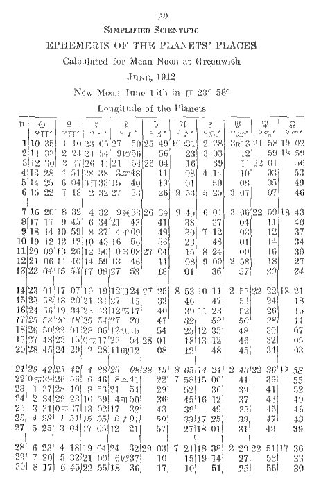 20) Simplified Scientific Ephemeris of the Planets' Places: