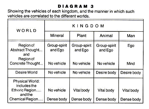 Diagram 4 shows that the group-spirit of the plant kingdom has its lowest vehicle in the Region of Concrete Thought. It is two steps removed from its dense vehicle and consequently the plants have a consciousness corresponding to that of dreamless sleep. The