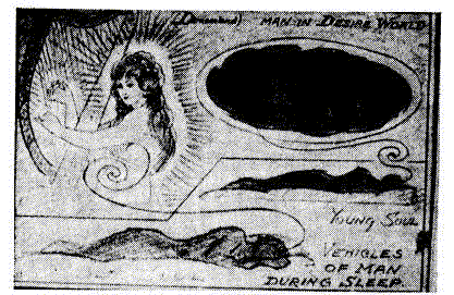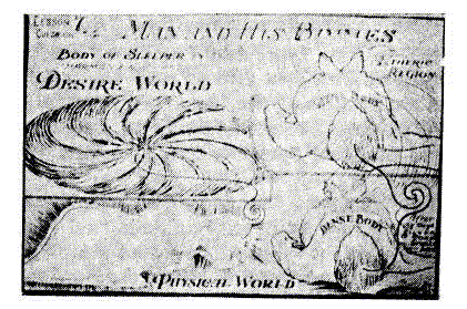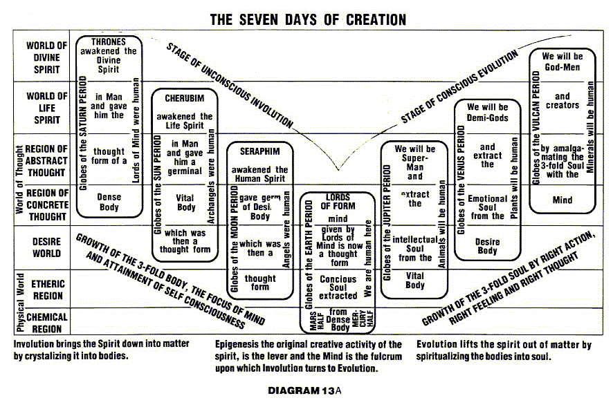 the diagram mentioned says clearly: "which was then a thought form." In the third column, representing the third Day or Moon Period, we read that the Seraphims, or Lords from Gemini, awakened the Human Spirit (which now becomes the Ego) and gave the germ (seed atom) of the desire body "which was then a thought form."