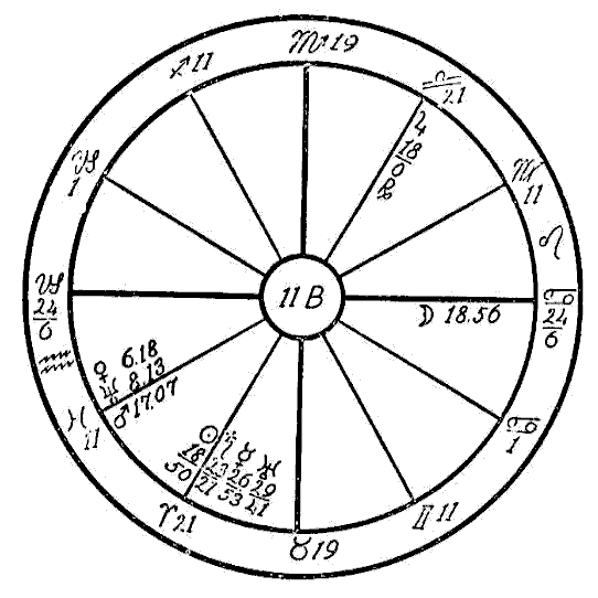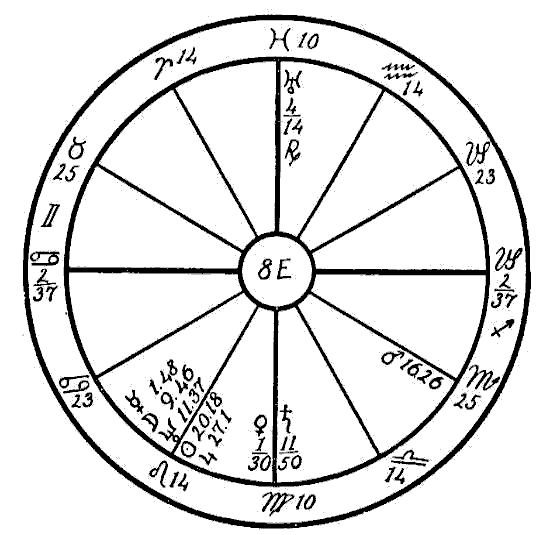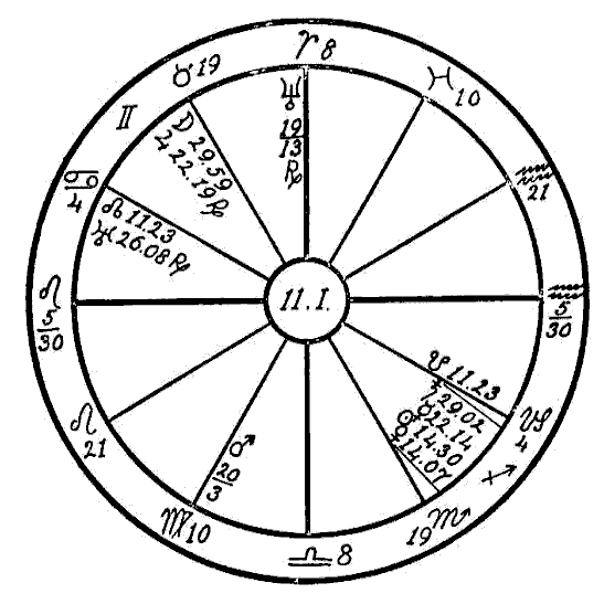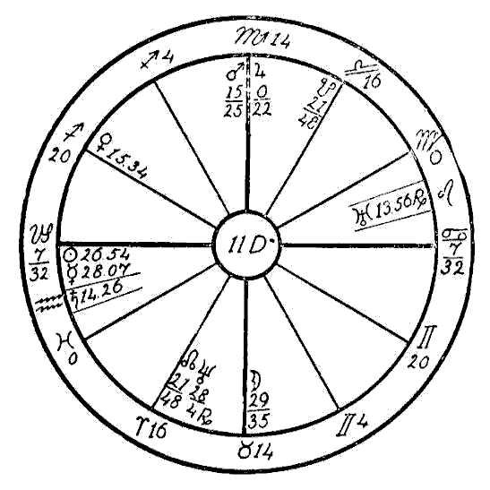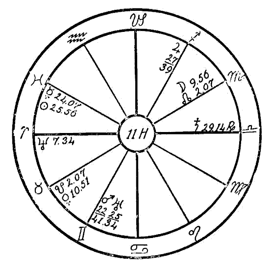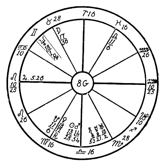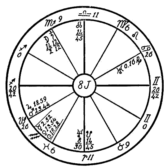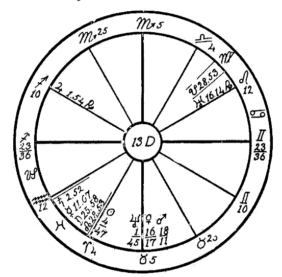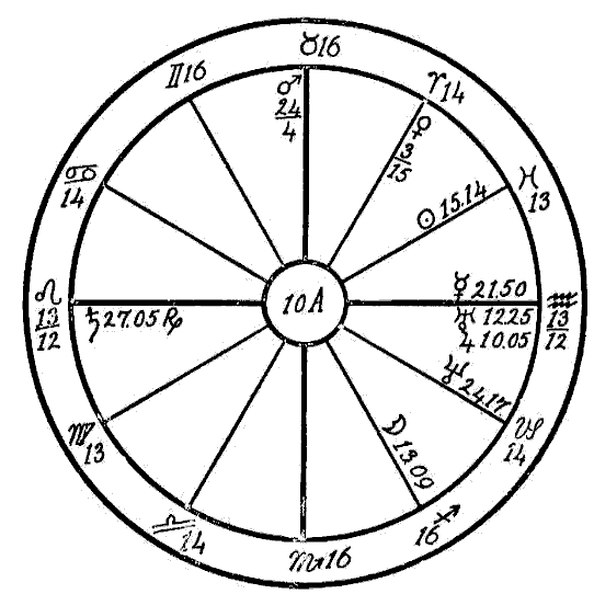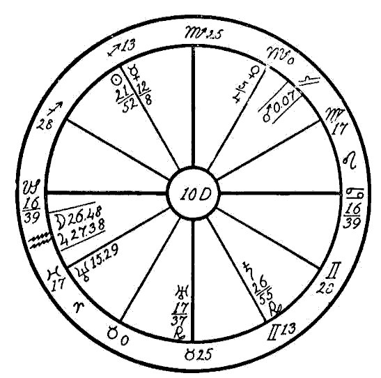 In the beginning of the year 1923 the progressed Moon was passing through the sign of Virgo and made a square to the radical Mars in Sagittarius. This disturbed the metabolism of the digestive tract, which on account of the resulting inflammation was unable to furnish the blood with the proper amount of mineral salts. This combined with the disturbed solar force caused by an afflicted Sun deprived the bones and the muscles of their —