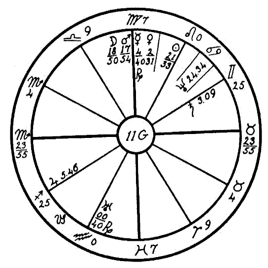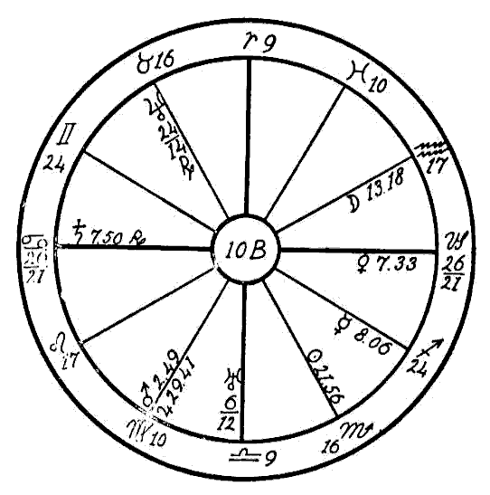 Here we have the ambitious, fiery sign of Aries on the Ascendant, with the Sun in the restless, nervous sign of Gemini in the house of finances, in conjunction with the persevering, tactful, thrifty, grasping Saturn. The ruler of the horoscope, Mars, is in the last degrees of Taurus, square to Jupiter. Jupiter has great love for finance. He likes it and therefore can —