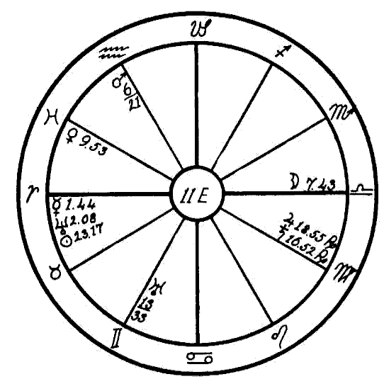 We will here examine the sympathetic aspects of planets in the cardinal signs. We find in this horoscope a most interesting lesson illustrating the sympathy and antipathy of the planets when placed in signs which are square or in opposition to each other. The horoscope of this young man has the common sign of Gemini on the Ascendant, with Mercury, Venus, Neptune, the Sun, Mars, and the Dragon's Head all in Cancer, the sign which has rule over the stomach. Four of these planets, namely, Mercury, Venus, Neptune, and the Sun are in opposition to Uranus and square to Saturn. The Sun is parallel to Uranus and Neptune; Neptune, Uranus, and the Sun are square to the Moon in Libra in the 6th house.