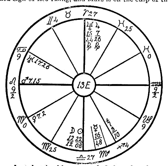 We also find Mars in the sign of Scorpio, square to Neptune, Sun, and Moon, which are in the fixed sign of Leo, the natural 5th house sign of pleasure. This soul had passed out of its former embodiment in a manner very similar to that of the woman with the first horoscope. The parents were only the instruments through which it received its lesson. How strangely the threads of life cross one another, weaving in and out with the threads of other persons' lives we have wronged, and who then must be the means through which we learn our lessons.