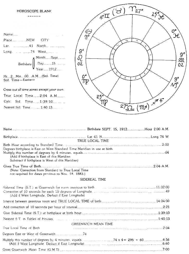 In Astrology Independent Study Module No. 5 we learned how to place certain signs and degrees of the zodiac upon the various cusps of the twelve Houses by means of Sidereal Time. In Independent Study Module No. 3 we learned how to calculate the Greenwich Mean Time which is used for the purpose of figuring out the exact positions of the planets in the horoscope. We will now proceed with our work on the experimental horoscope for July 23rd, 1912, in which we found that the Greenwich Mean Time was July 23rd, 10:56 A.M.