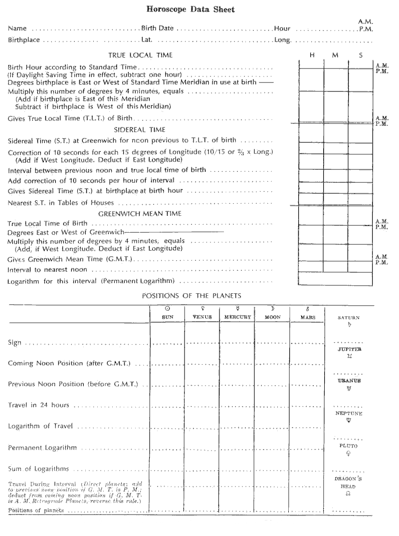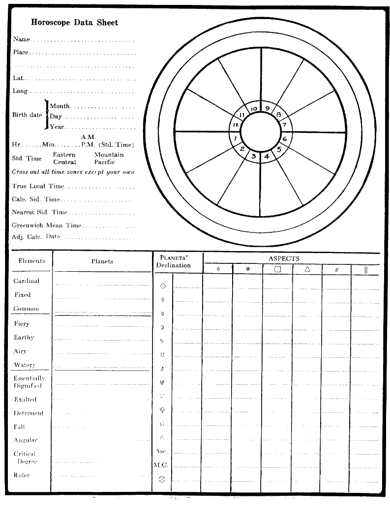 1. In Astrology Independent Study Module No. 9, I asked you to calculate the signs on the cusps of a horoscope for 4 P.M. Standard Time, August 10th, 1912, at New York. Please figure now the places of the planets, insert them in the horoscope and send it to me, that I may see if you remember how to do this work. [Please refer to "Information for Astrology Course" for help with this assignment.] [optional]