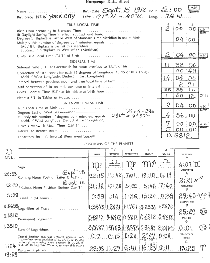 This Independent Study Module will be devoted to reading the chart for August 10, 1912, 4 P.M. which was indexed in Astrology Independent Study Module No. 20. We will number the various steps of the delineation so that they may be referred to as required. The references below are to The Message of the Stars.