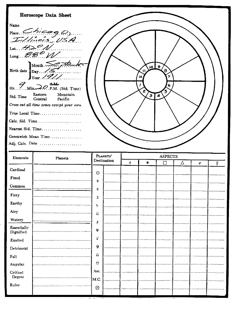 1. Please erect the horoscope for a child born September 15, 1911, 9:20 P.M., Standard Time, at Chicago, Ill., Latitude 42 N., Longitude 83 W.