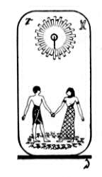 In Arcanum XVII we found a representation of a maiden who typifies a pioneer of the Aquarian Age also. In Arcanum XIX we see the the youth and maiden united in the glory of the bright day when all sorrow, poverty, pain and death have passed away, and life eternal prevails. Here man and woman — the new Adam and the new Eve — stand triumphant, hand in hand, knowing perfect equality and perfect spiritual equilibrium on every plane of manifestation. Above their heads shines a vast luminous sun that bears within its heart the symbol of universal regeneration. As we meditate upon this glorious golden Light we hear the voice of the supreme Master saying, "I am the Light of the World"; and the voices of the youth and the maiden respond in the words of St. John, "If we walk in the Light as He is in the Light, we have fellowship one with another."