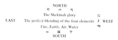 On the north are Dan, Asher and Naphtali. Dan (Scorpio) symbolizes the creative fires, the principal factor in the regenerative process; Asher (Libra), according to Jacob's admonition, bears a light unto Dan's darkness; Libra, the trial-gate of the ancients, betokens the parting of the ways between flesh and the spirit, the right choice leading to the birth of the Christ consciousness; Asher, meaning to be happy, was an early name for the Moon and comes from a root meaning the wandering one. Naphtali (Capricorn) is the power of truth and wisdom attained only through controlling the inner fires. A goat was an ancient symbol representing the hidden powers of generation.