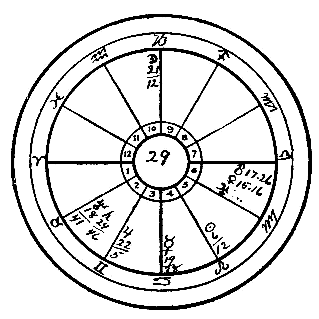 In the case before us we have not the hour of birth, and will therefore insert the signs in their respective Houses, commencing with Aries in the First, Taurus in the Second, etc. This person was born November 27, 1867.