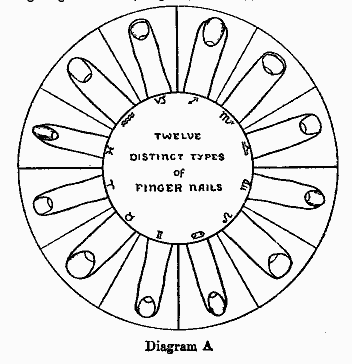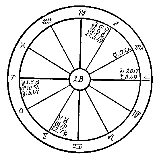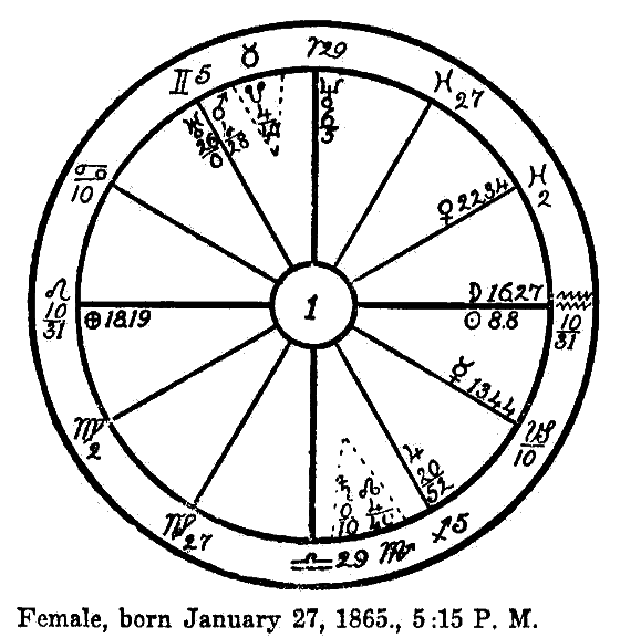 We find that there are common signs on the angles, which is a testimony of a flexible character, difficult to rouse from sickness or trouble into which the native may fall. The Moon in conjunction with Saturn in Aquarius, the sign which governs the ankles and lower parts of the limbs, is evidence of a poor circulation; and Uranus in Leo, the sign of the heart, in opposition to the Moon and Saturn shows that there is a fluttering of that —