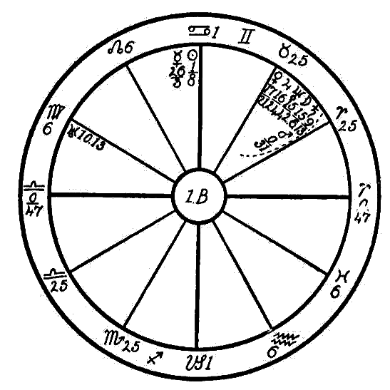 Worry over financial loss aggravated the eye trouble from which he had suffered for a number of years. He has been an incessant reader and has put a heavy strain on his eyes. The mental disturbance over his financial loss weakened the nervous system, causing him to lose the sight of one eye. We find the Moon in 29 degrees of Taurus conjunction the Pleiades and square to Neptune; Jupiter is in 10 degrees of Gemini in the 6th house, that of sickness, in opposition to the fixed star Antares, which is situated in 8 degrees of Sagittarius; also Jupiter is making a square to the obstructing Saturn, all indicating eye trouble.