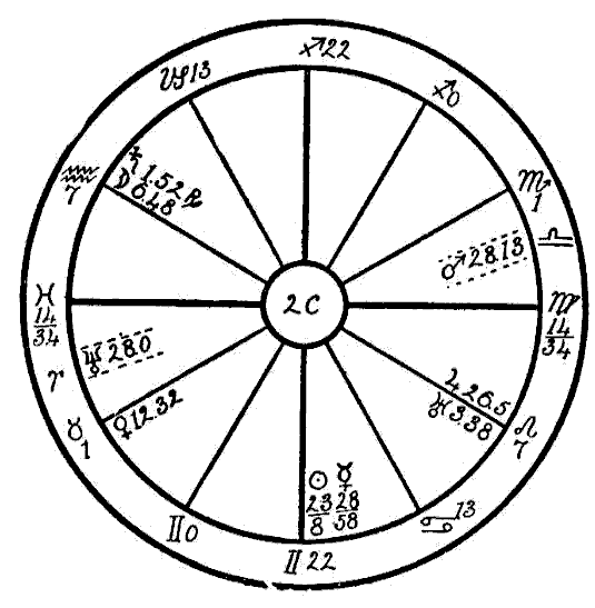 With Saturn in its sign of exaltation, Libra, square to Mercury in the Saturnian sign of Capricorn, we meet the vicious circle of the cardinal signs. The Sun in Capricorn afflicted by a square of Neptune, both in cardinal signs, together with the parallel of the nervous and excitable Uranus to the hot and inflammable Mars has caused a succession of abscesses in the frontal bone, resulting in partial deafness in both ears. Here we find the previously mentioned circle culminating in the ears. The writer has found numerous cases of partial deafness resulting from an afflicted Mercury in