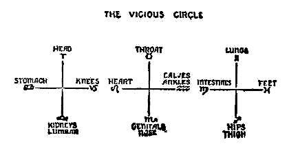 The four points of the circle of the cardinal or equinoctial signs, namely, Aries the eyes, Libra the kidneys, Cancer the stomach, and Capricorn the knees, are closely in sympathy with one another, and trouble in one will frequently manifest in one of the other signs of this circle. For instance, if we find Saturn in the sign of its fall, Cancer, and afflicted, digestive troubles ensue and invariably the kidneys will be disturbed; sometimes stiff knee joints are the result. Eye troubles are frequently developed as a result of wrong eating. People with Saturn in Cancer are extremists in their selection of food. They have strange likes and dislikes.