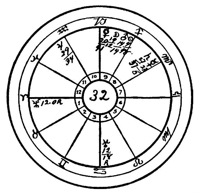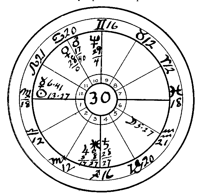 Horoscope No. 2 shows one of the most remarkable psychic conditions we have ever come across. Its portents in some respects are plain to any astrologer, but investigation by one of the writers into this person's past life adds sidelights and gives depth to the meaning of configurations not otherwise obtainable; also to the writer, who made the spiritual investigation two years before the horoscope was cast, it was a revelation to note how the mystic facts he remembered so well, were inscribed in this little wheel of life. To enable the student to properly appreciate the remarkable case we relate the story of how we came into connection with the person, what we attempted to do, and what actually happened.
