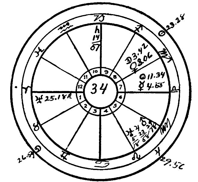 Horoscope No. 3 shows the inimical influence of the nebulous spot in Leo 6, the Ascelli, on the sight. This dangerous degree was rising at birth with the Moon in close conjunction, and the Sun also in orb. Saturn in 24 degrees of Libra is just within orb of a square to the Sun in Leo 0 degrees, and as a result of these various afflictions the person is compelled to use bifocal glasses. There is a compensating advantage, however; Neptune in elevation and trine to the Ascelli (with Sun, Moon and Ascendant in orb), has endowed him with spiritual sight over which he has perfect control, as the student may readily see by examination of Mercury, the best fortified planet in the horoscope. Saturn, by sextile, from the sign of his exaltation, gives steadiness, persistence and concentration; Jupiter by trine from the house he rules expands the mind, makes it religiously inclined and benevolent; Venus by sextile, adds kindness and love of beauty. Thus it is evident that in this horoscope the relation of Mercury and its octave, Neptune, to physical and spiritual expression of mind, is well illustrated. Neptune is most highly elevated and Mercury is most strongly aspected. Neither is afflicted, therefore he is not liable to hallucinations, but weighs his experiences in the scale of logic. Compare this horoscope with that of the poor young man afflicted by the Guardian of the Threshold (No. 2), where Neptune is in the Twelfth House in conjunction with Mars, and where Mercury is afflicted by the opposition of Saturn, all from Cardinal signs; contrast of the two figures will bring out some fine points.