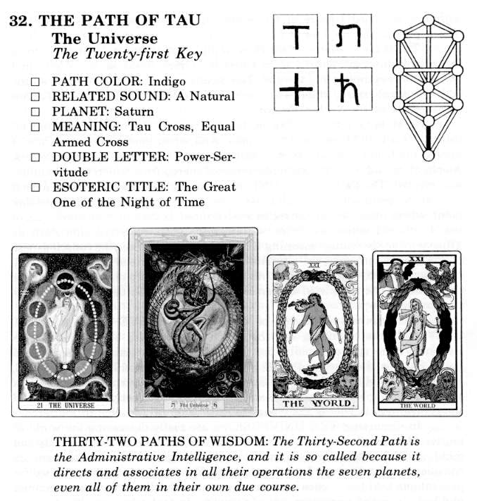 The Tarot glyph for Tau is symbolic of the human race being left without protection of the Divine Feminine until it has passed through all manner of trials and tests. This is shown in the broken obelisk, covered with hieroglyphics. We see a lightly clothed man, laden down with a burden which hangs front and back, blindfolded and is oblivious of the crocodile which lurks behind the fallen obelisk waiting to devour his prey. The man leans on a thin frail staff which fails to warn him of the gaping jaws into which he will surely fall. The Sun is partially eclipsed by a shadow, symbolizing fear, but also hope, since the Sun will shine again in due course. Truly,
