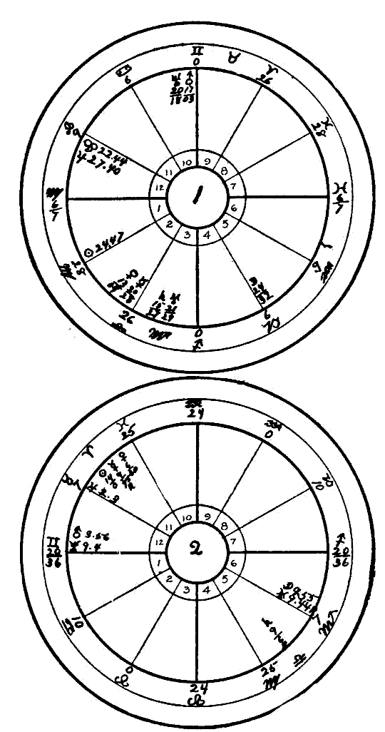 Horoscope No. 2 shows one of the most remarkable psychic conditions we have ever come across. Its portents in some respects are plain to any astrologer, but investigation by one of the writers into this person's past life adds sidelights and gives depth to the meaning of configurations not otherwise obtainable; also to the writer, who made the spiritual investigation two years before the horoscope was cast, it was a revelation to note how the mystic facts he remembered so well, were inscribed in this little wheel of life. To enable the student to properly appreciate the remarkable case we relate the story of how we came into connection with the person, what we attempted to do, and what actually happened.