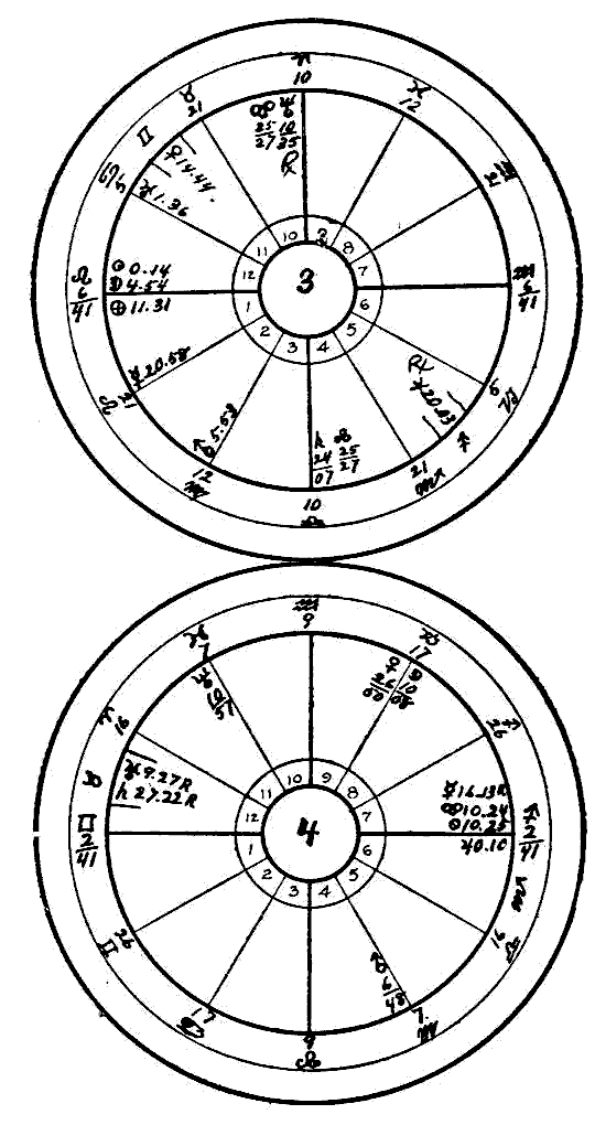 But No. 3 shows a case of organic weakness of the heart. The Sun is at home in the fixed sign Leo and receives a square from Saturn the reaper; thus it is evident that the heart was a weak link in the constitution and would cause trouble in time, unless care was taken. Unfortunately of course, parents knew less about Astrology a generation ago than today, when the science is coming to the fore. The energy of which this horoscope is full, was allowed to spend itself unrestrained with no thought given to coming disaster.