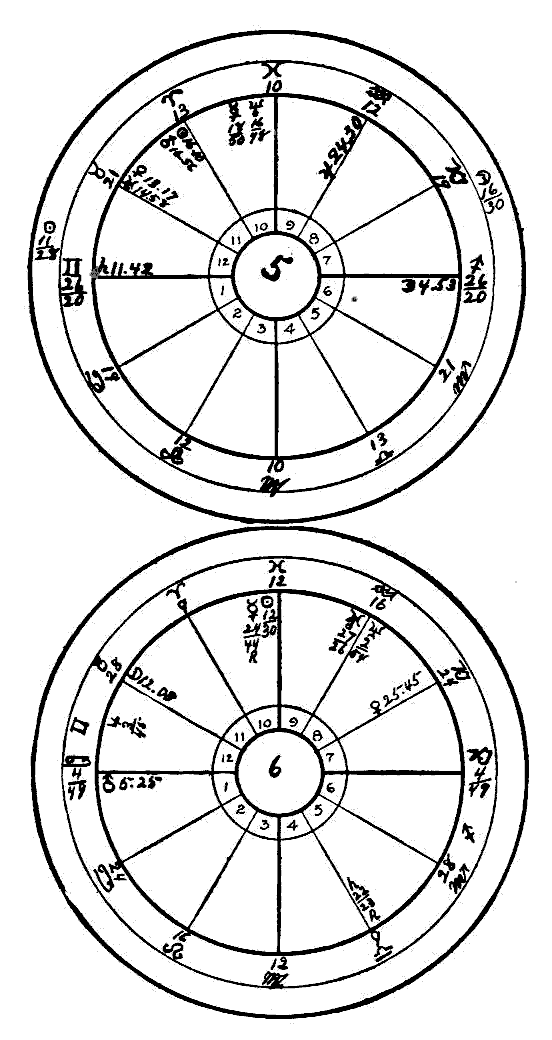 In horoscope No. 5 we see the Moon in the Sixth House, about three degrees from Antares, and Saturn is in the Twelfth House within 4 degrees of an opposition to Antares, about 7 degrees from exact opposition to the Moon; thus his natal influence was minimized. Had the opposition been close or exact, blindness from birth would have been inevitable, but fortunately it was a weak aspect and the vision was not seriously affected until the Sun by progression entered the Twelfth House, passed the opposition to the Moon, then opposition to Antares and arrived at conjunction with Saturn. These points of contact in the horoscope marked crises in the disease of the eyes. Saturn being the afflicter, the nerves and muscles crystallized until sight of one eye was lost and the other eye is almost blind. In November, 1912, the Moon had progressed to the square of the Sun's place at birth. That was the final crisis which vivified the before-mentioned aspects. Neptune makes not aspect to the points of the Zodiac mentioned, hence the spiritual sight is deeply dormant.
