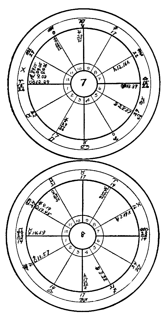 Experience has proved that the afflicted stellar ray from certain parts of the Zodiac already mentioned, interferes with the etheric vibration sensed by the retina of the eye, and thus impairs the physical sight. If, in the same figure, Neptune is focused through one of these places, the so-called "blind spot," which is blind because unresponsive to the etheric mercurial vibrations is sensitized by the spiritual ray of Neptune, and thus it may be that a person physically near sighted, or even blind, may view the spiritual worlds hidden from people whose sight is focused by mercurial vibrations. The aspect of Neptune determines the grade and nature of the spiritual sight evolved, as illustrated in various horoscopes herewith. These were picked to demonstrate other points, but it occurred to us that the phase just mentioned is worthy of notice. It may be well, however, to warn students against absurd conclusions; we do not say that everyone afflicted with eye trouble by Antares, Ascelli or the Pleiades is gifted in return with spiritual sight. The woman in horoscope No. 5 is much afflicted physically, but Neptune is out of orb, and she derives no vision from his ray. Spiritual vision may also be undeveloped in many who have the aspect well defined, but in those cases it is in process of unfoldment, and will yield easily to proper exercises. Where this aspect is a square or opposition it is wise, however, to refrain from any attempt to seek illumination, for in those aspects lurk great danger from spirit controls, elementals, etc., which is amply illustrated in horoscope No. 2, where the opposition of Neptune to Antares is responsible for the awful vision of the Guardian of the Threshold. There the physical sight is not impaired, but in horoscope No. 3, defective eyesight is shown by affliction from the Ascelli and like trouble comes from Antares in No. 4. In one the trine from Neptune produces voluntary vision of the super-physical realms, but in the other his focus is square, hence the spiritual sight obtained is intermittent and not under control.