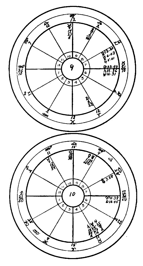 Among the subjects germane to thorough knowledge of Astrology are the similar effects of intrinsically opposite factors; Saturn is called evil, and Jupiter good, but when Saturn is well fortified in a horoscope it has an exceedingly desirable effect, and an afflicted Jupiter is the very reverse of beneficial. Thus there is a good side to each so-called "evil" plant, and every "good" planet has also an undesirable phase. The signs of the Zodiac are said to rule certain parts of the body, but each sign has also subsidiary dominion over the part ruled by its opposite sign; affliction of Gemini may cause bronchitis, or weaken the arms and shoulders, but sciatica, a Sagittarius disease, may also result. Taurus rules the throat; it has great sympathy with Scorpio, the sign that rules the generative organs, hence we note the change of voice in boys at the time of puberty; also woman, when she forsakes the path of chastity and lives a life of debauch acquires a coarser voice. Taurus rules the larynx, but Mercury governs the air which stirs the vocal chords to vibration; thus organic affliction is indicated by affliction of Taurus and Scorpio, but functional disability by the position and aspect of Mercury. There is a similar relation between Taurus (ruling the vocal organs) and Mercury (ruling the air which passes through the larynx) as between instrument and player. If Taurus (and Scorpio) are unafflicted the vocal organ is in good condition, but an afflicted Mercury may nevertheless cause a functional disorder of the speech. The reverse may also happen, namely, that a well fortified Mercury partially overrides the effect of a Taurus affliction. This is well exemplified in Horoscope No. 9; Saturn, Neptune and the Sun conjoined in Taurus cause a throat affection, but Mercury is in a sign of voice, Gemini, (Libra and Aquarius are the other signs of voice) and in conjunction with Jupiter. The woman suffers constantly from throat trouble, but as a good musician draws melody from a dilapidated instrument, so, by the aid of her well placed Mercury, this woman is able to express herself better than many whose vocal organs are sound; in fact, she teaches elocution.