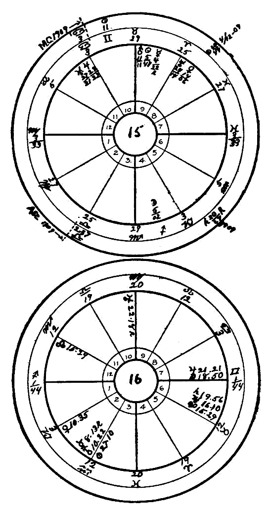 No. 14 is the horoscope of a young man. The common sign, Gemini, is rising, the ruler, Mercury, is in the Eighth House, the house of death, and Uranus and the Moon are in opposition to Mercury. This configuration, is similar to that of No. 12, and has the same significance, namely, suicidal tendencies under nervous strain, and this augur is all the more dangerous as it comes from fixed signs. Mars and Neptune in Taurus give a desire for drink and the Sun in a watery sign accentuates this tendency. Under such circumstances the man has several times tried to end his life in a most extraordinary manner. Jupiter and Sagittarius, square to Saturn in Pisces, increases the looseness of his morals and makes him dishonest. He will forge and steal in order to satisfy his passion and craving for drink and questionable society. Leo on the Second House with Uranus and the Moon in close conjunction, shows that he spends what he gets in dissolute living.