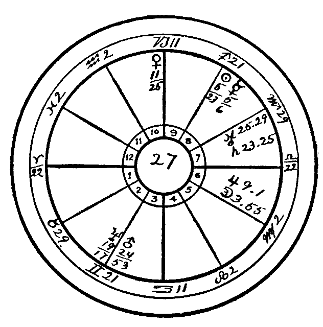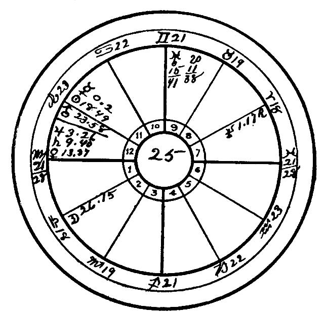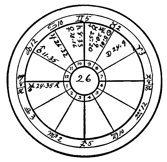 There is one redeeming feature in the horoscope: Venus in the Midheaven sextile to his ruler, and trine to the Moon. He has energy and artistic ability which, it is hoped, may in time rouse the better qualities and make him a man. But again we reiterate that with the affliction from fixed signs the obstacle is almost insurmountable.