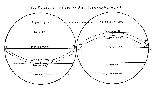 As it has often been a sore puzzle to students what are the "Dragon's Head" and "Tail" (called the Moon's nodes in the ephemeris), and why one is supposed to be good and to further all that comes under its benefic ray, while the other is considered extremely evil, it may be well to show the reasonableness of the philosophy.