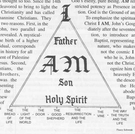 St. John's Gospel, the New Testament's most esoteric account of the life of Christ Jesus, alone elaborates and meditates on the three Persons of God: the Spirit of Truth or Comforter, the I AM or Christ Logos, and the Father. Only in John is the I AM nature of Christ explored. I denominates God's essence, pure Being. AM reflects God's unrestricted potency as Presence in holy Self-cognition. God is the Ground of any and all being.