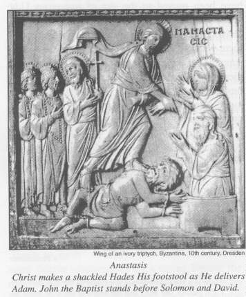 What was the Scriptural justification for this dramatic action? The promise to David is fulfilled: "Lord, thou hast brought up my soul from the grave" (Psalm 107); "For he hath broken the gates of brass and cut the bars of iron in sunder." Peter exclaims, after the descent of the Holy Spirit on Pentecost, that now his flesh rested in hope "because thou wilt not leave my soul in hell" (Acts 2:27).