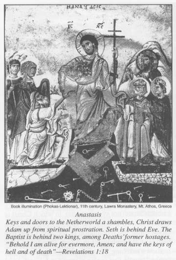 The Eastern Church's Easter picture is not an empty sepulcher. This scene of hope mingled with bewilderment may suggest Resurrection. But where is the Resurrected, the Overcomer? He is resurrecting fallen, indeed, prostrate and sleeping, humanity. He has burst asunder the "brass gates of cruelty"; He has rendered useless the keys to an infernal kingdom; He has made the captor Death captive to His Light; He has taken "our earthy father Adam with him to his glory."